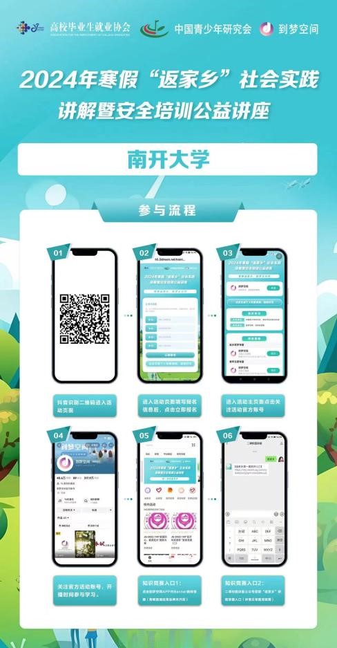 为深入学习宣传贯彻党的二十大精神,贯彻落实习近平总书记关于青年工作的重要思想,切实做好“返家乡”“三下乡”社会实践工作,大力培育和践行社会主义核心价值观,加强优秀传统文化教育,弘扬和培育民族精神。公司联合中国青少年研究会和高校毕业生就业协会、到梦空间共同开展第二课堂系列公益讲座——2024年寒假社会实践安全培训讲座。现将具体事宜通知如下: