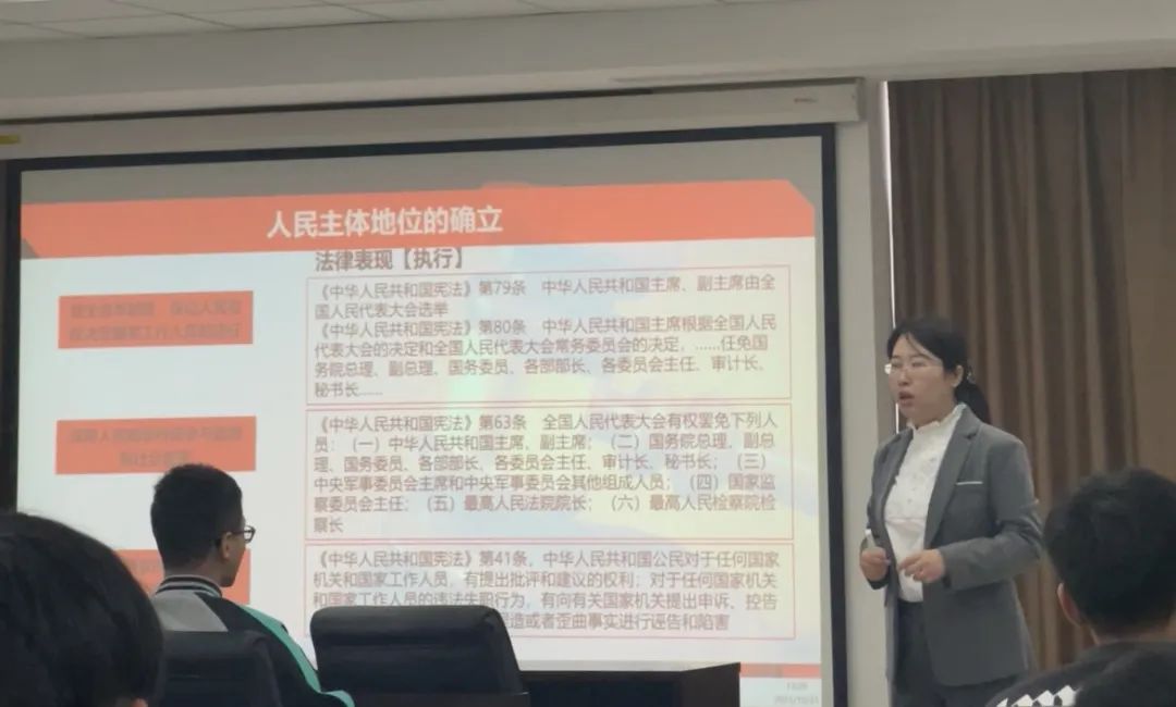 李高扬以“人民和人民观”为切入点,为学员们讲述中国共产党不同历史时期对于人民范畴的不同定义,进一步为大家解读习近平法治思想的人民观。并通过引用《习近平谈治国理政》中的金句以及与《民法典》相关内容,指出“坚持以人民为中心”是指导中国特色社会主义法治建设的核心原则,这一原则不仅仅停留在纸面和口头上,在立法、执法、司法和守法等法治运行的各个层面得到充分贯彻和践行。结合学员们日常的学习生活,李高扬指出当大家临近毕业时需要签订的就业协议书属于预约合同,其作用是为了避免大家错过就业时机,学员们签订就业合同时应当仔细阅读并检查其内容,签字时一定要严谨慎重,在日常生活中要学会运用法律武器维护自己的合法权益。