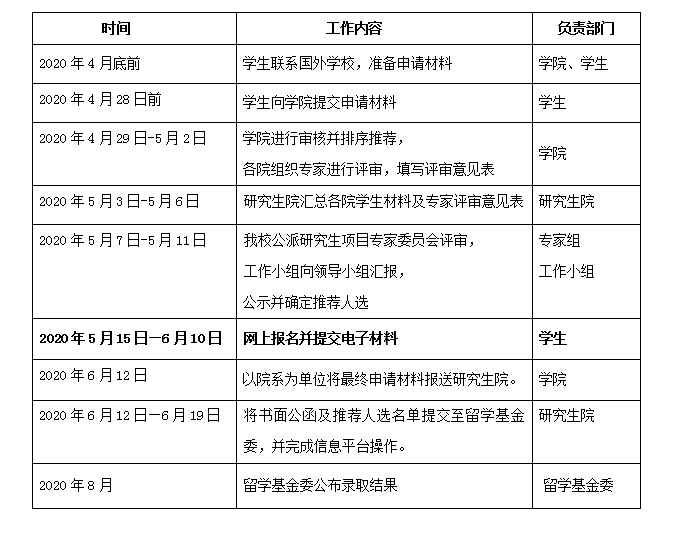 国家建设高水平大学公派研究生项目联合培养博士研究生、博导短期出国项目安排调整后,网上报名时间为5月15日-6月10日,公司于6月19日前将书面公函及推荐人选名单提交至留学基金委,录取结果于8月公布。