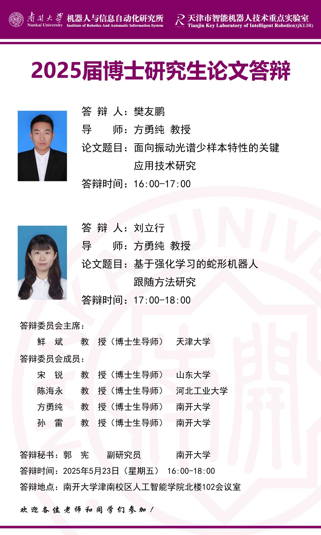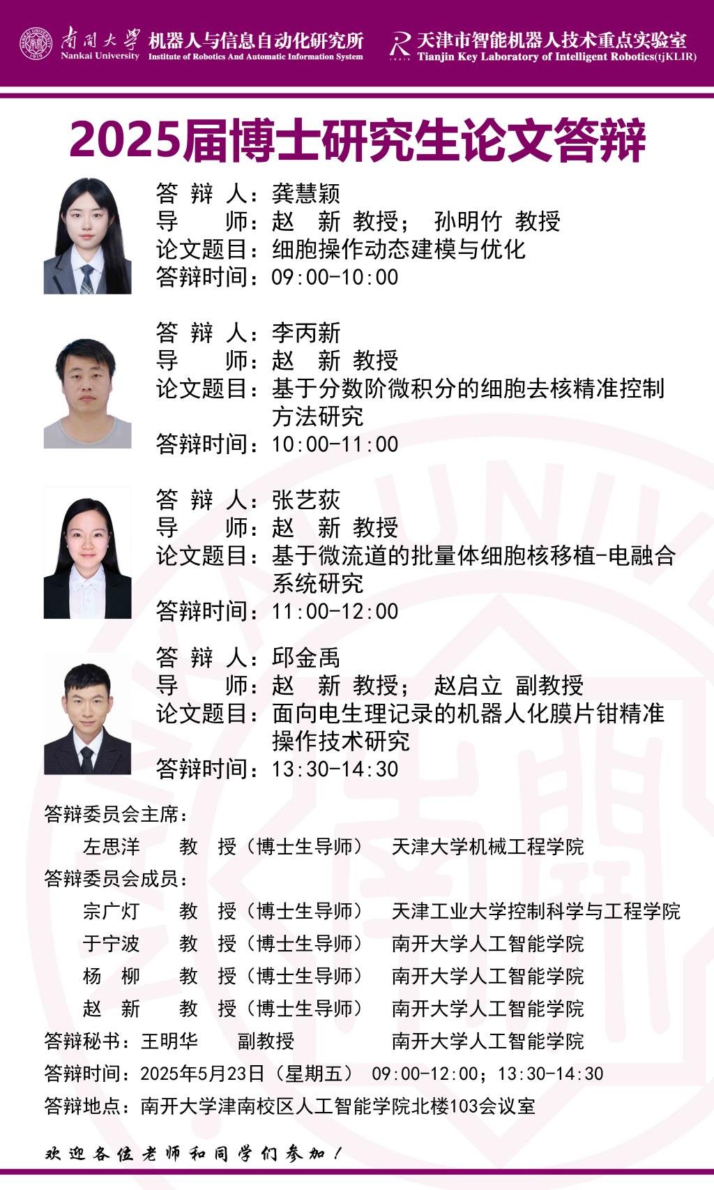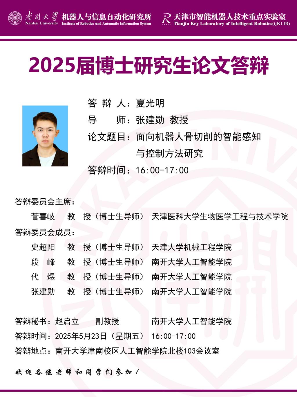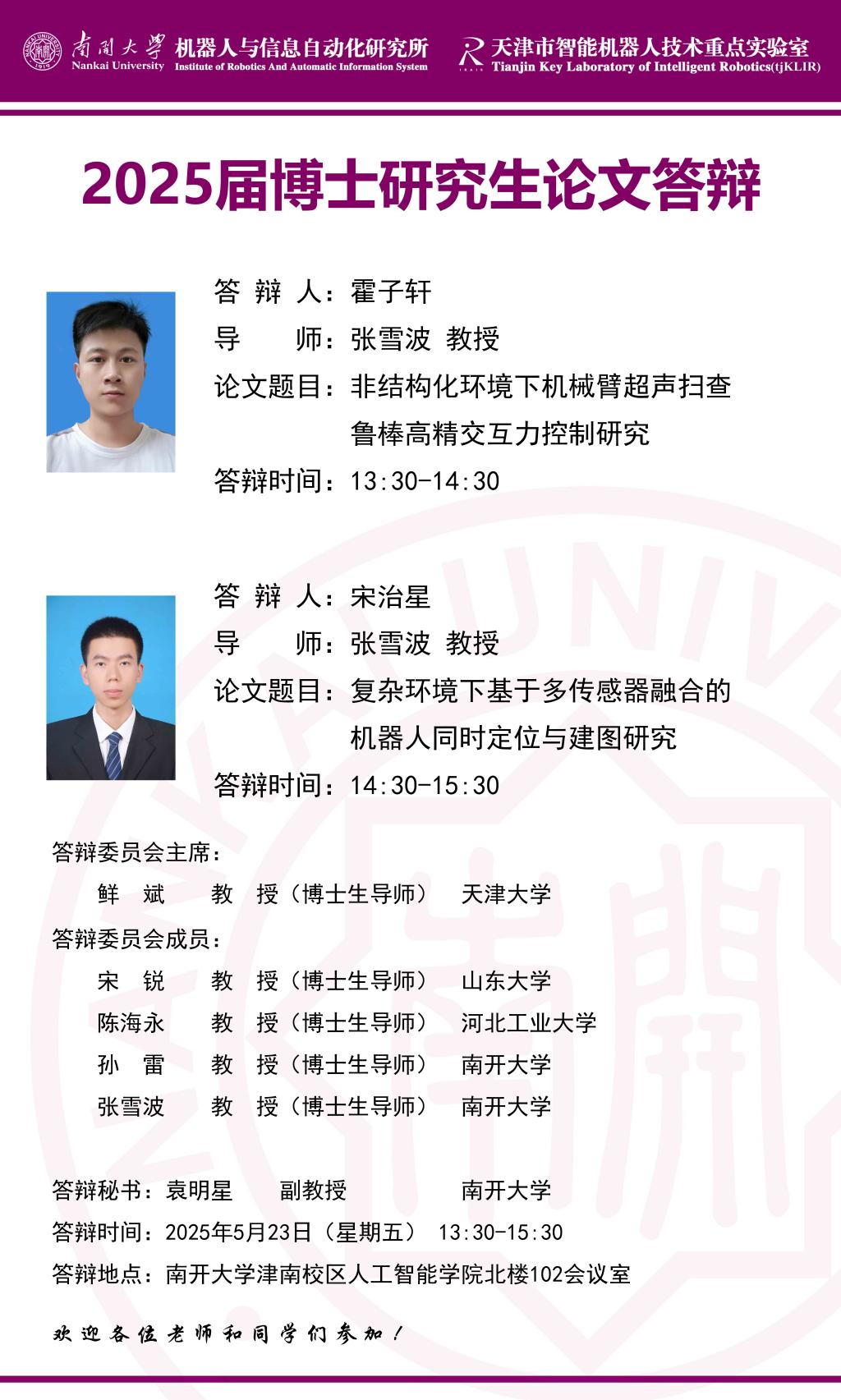 【答辩】2025届夏季毕业答辩公告----机器人与信息自动化研究所(博士)